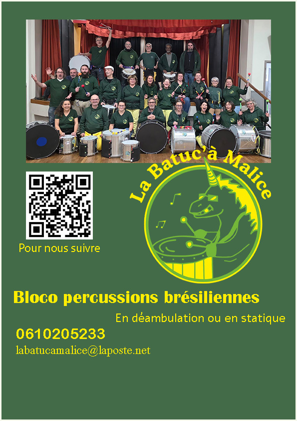 La Batuc’à Malice, batucada de Malicorne sur Sarthe propose des animations de rue dans le cadre d’événements festifs publics ou privés, commerciaux , municipaux ou associatifs. (ouverture ou clôture d’un événement ou animation sur un ou des moments clés de votre journée, carnavals etc…)