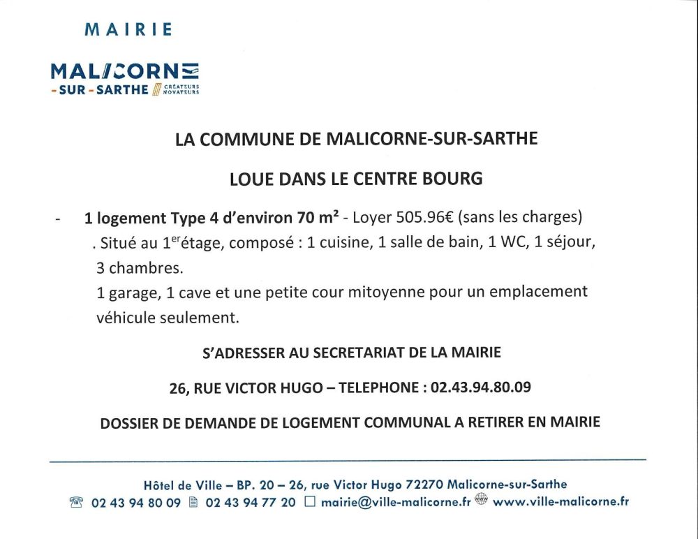 LOGEMENT A LOUER COMMUNE DE MALICORNE