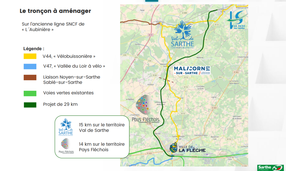 Un premier tronçon de 13 km, au départ de La Suze-sur-Sarthe, est accessible depuis décembre 2024. On y recense déjà 4 000 piétons et 7 700 vélos dans ce secteur. Par ailleurs, pour la sécurité des futurs utilisateurs de la voie verte, un ouvrage d’art inférieur sous la RD23 a été réalisé à Saint-Jean-du-Bois.